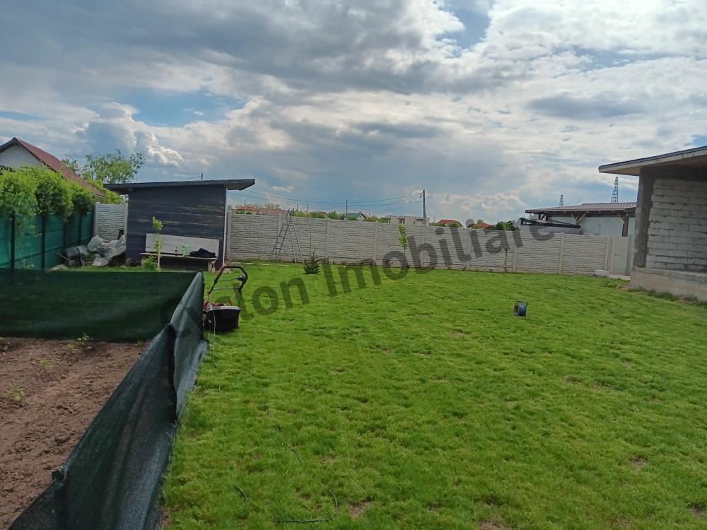 Curtea este împrejmuită cu gard, amenajată cu gazon și pomi fructiferi